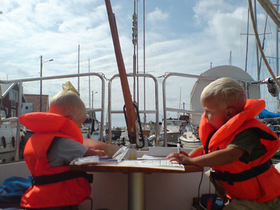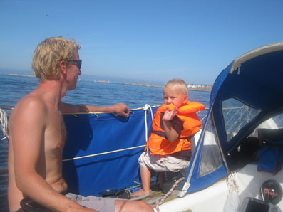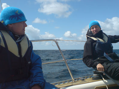 Två sjömän helt ovetande om dagens kommande strapatser. En prognos på max 11 sekundmeter i byarna blev till max 14,5 sekundmeter och en medelvind kring kuling. Sjön gick hög och den 28 år gamla båten fick visa vad den går för. Seglingen tog 8 timmar och vi fick chans att lära oss en hel del av den erfarne seglaren Joakim till vänster.