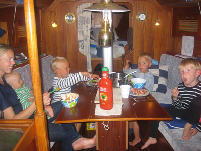 Middagsgäster sista kvällen på båten. Dagen efter väntade fem timmars segling tillbaks till Brottkärr/ Amundön. Först riktigt gropigt, sedan Albrektsund kanal för motor och efter det finfin segling förbi Göteborg. |