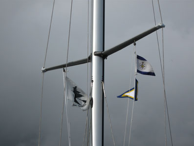 I styrbords spridare på en båt vid stora bryggan vajar en ny sorts vimpel. På engelska står det: Wife om board (=Hustru ombord) och bilden är förbluffande lik den berömda häxan som far till Blåkulla.