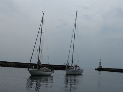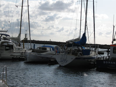 Utanpå mellersta pontonbryggan ligger sedan i söndags en stor bamsig Bavaria Vision 44. Hon har motorfel av något slag.