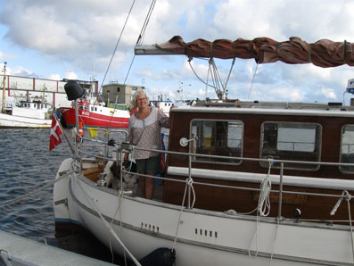 Motorseglaren "Grollen" från Kulhage i Danmark hade en vänlig skepparmor ombord med en gullig vovve som kan skymtas vid hennes sida.