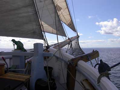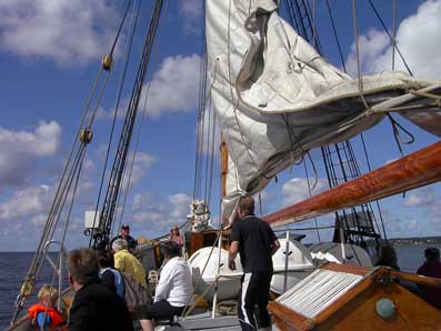Bilderna är tagna under en segeltur med danska galeasen Haabet. När vi gick ut ur Halmstads hamn mötte vi självaste skeppet Götheborg som var någon dag försenat till Halmstad därför att man haft hårt blåsande i Bohuslän. När man far ut med något av skeppen får man gärna hjälpa till med segelhanteringen. Galeasen Haabet satte fem stora segel och det var många "snören" att dra i!