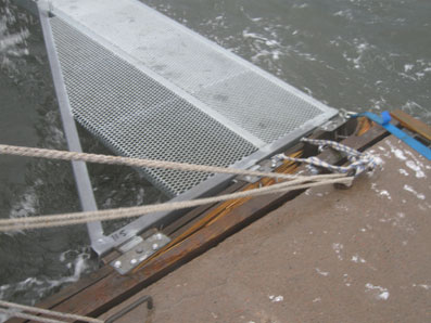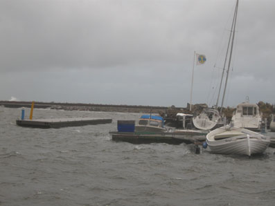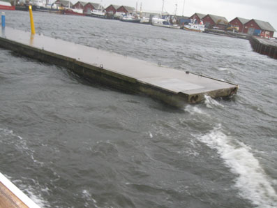 Pontonen strax innanför inre hamnöppningen hade flyttat sig! Detta skapar en öppning för vågorna att gå rakt in på de yttre båtarna vid A-bryggan. |