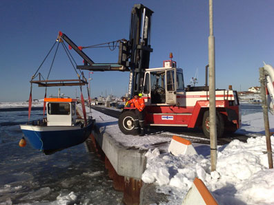 | Christer Nilsson har skaffat sig en ny stöddig maskin som bland annat går att använda när vi sjösätter båtar. Den är på 15 ton och har ett utlägg på fyra meter |