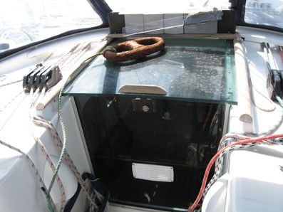 När webbredaktröen gick ombord på sin båt på måndag morgon såg det ut så här. En stor tung kättinglänk var kvarlämnad på nedgångsluckan efter försök att med den slå sig in i båten vilket misslyckades.